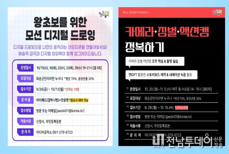 전남투데이 강영선 기자 | 화순군(군수 구복규)은 오는 10월 15일과 20일 화순군 청년센터(청춘들락) 미디어공작소에서 영상 제작과 디지털드로잉 분야의 창의적 미디어 교육 프로그램을 시작한다고 밝혔다.
