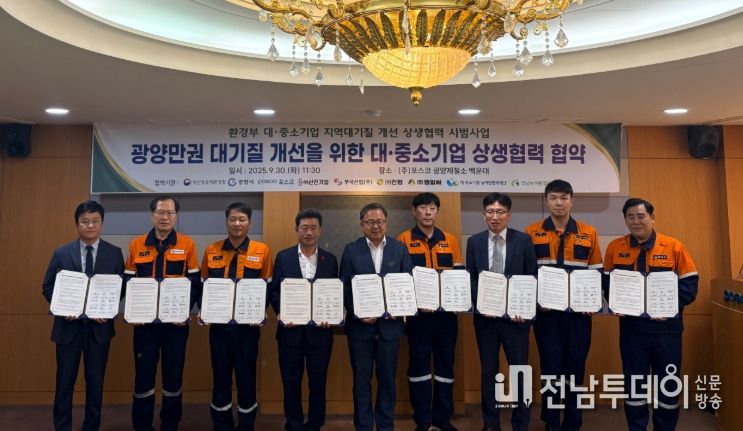 전남투데이 손영욱 기자 | 전남녹색환경지원센터는 9월 30일 ㈜포스코 광양제철소 백운대에서 ‘광양만권 대기질 개선을 위한 대·중소기업 상생협력 협약’을 체결했다.
