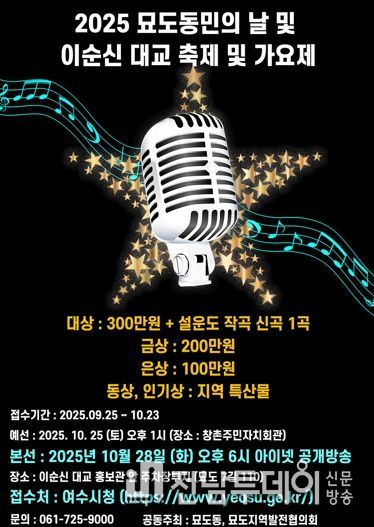 올해 처음으로 개최되는 이순신대교 가요제는 전국의 가수 지망생들이 참가해 실력을 겨루는 미래 스타 발굴 무대로 주목받고 있다. 참가 접수기간은 오는 10월 23일까지이며, 예선은 10월 25일 오후 1시 창촌주민자치회관에서, 본선은 10월 28일 오후 6시 축제 무대에서 열린다.