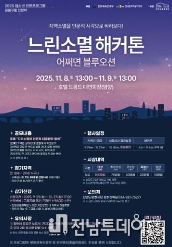 전남투데이 탁상훈 기자 | 담양군문화재단은 오는 11월 8일부터 9일까지 지역소멸 대응 인문사회적 문제해결방안을 탐색하는 「느린소멸 해커톤」을 개최한다고 밝혔다.