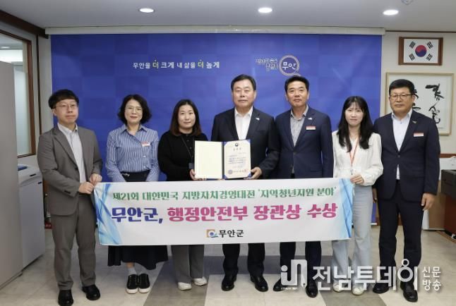 전남투데이 김길룡 기자 | 전남 무안군은 행정안전부와 한국일보가 공동으로 주최한 '제21회 대한민국 지방자치경영대전'에서 지역청년 지원 분야 우수기관으로 선정되어 행정안전부 장관 표창을 수상했다.