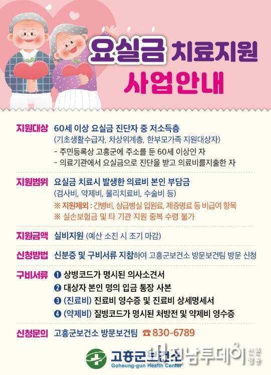 전남투데이 조평훈 기자 | 고흥군은 관내 60세 이상 저소득층 어르신을 대상으로 ‘요실금 치료 지원사업’을 시행한다고 밝혔다.