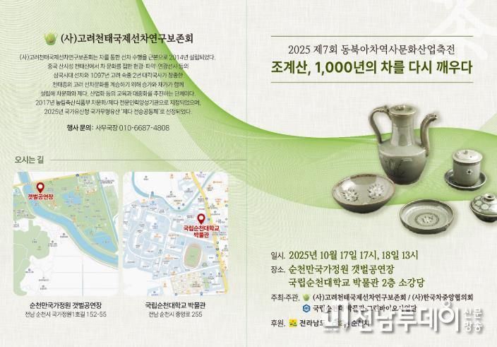 전남투데이 조평훈 기자 | 전통 제다문화의 역사와 미학, 예술적 감성을 아우르는 ‘제7회 동북아 차역사문화산업축전’이 (사)고려천태국제선차연구보존회 주관으로 오는 17일부터 18일까지 순천만국가정원 갯벌공연장과 국립순천대학교 박물관에서 열린다.