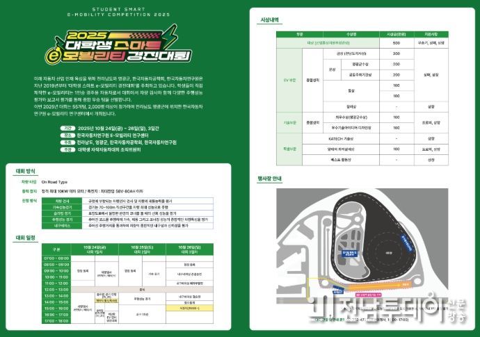 출전 차량은 10kW 이하 전기모터를 장착한 초소형 전기차급 모빌리티로, 성능검사·가속·슬라럼·내구레이싱 등 기술력과 주행성능을 종합 평가하는 경기로 진행된다.