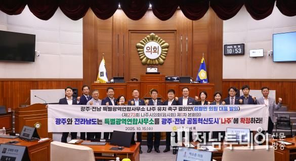 나주시의회는 이번 건의안을 통해 ▲광주·전남 특별광역연합 규약에 사무소 소재지를 명시적으로 광주·전남 공동혁신도시(나주시 빛가람동)으로 확정할 것과 ▲후속협의 전 과정에서 상징성·정합성·거버넌스 접근성을 가산요소로 명문화하고, 다른 현안과의 정치적 교환·거래를 일체 배제할 것, ▲정부·광주시·전남도는 나주 유치에 필요한 인프라와 예산을 조속히 확정하고, 연합 출범 일정과 연동해 행정 공백 없이 집행 계획을 제시할 것을 촉구했다.