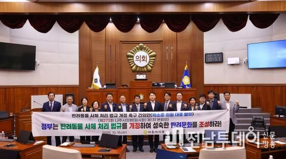 전남투데이 김윤걸 기자 | 나주시의회는 15일 제273회 임시회 제1차 본회의를 열고 ‘반려동물 사체 처리 법규 개정 촉구 건의안’을 채택했다.
