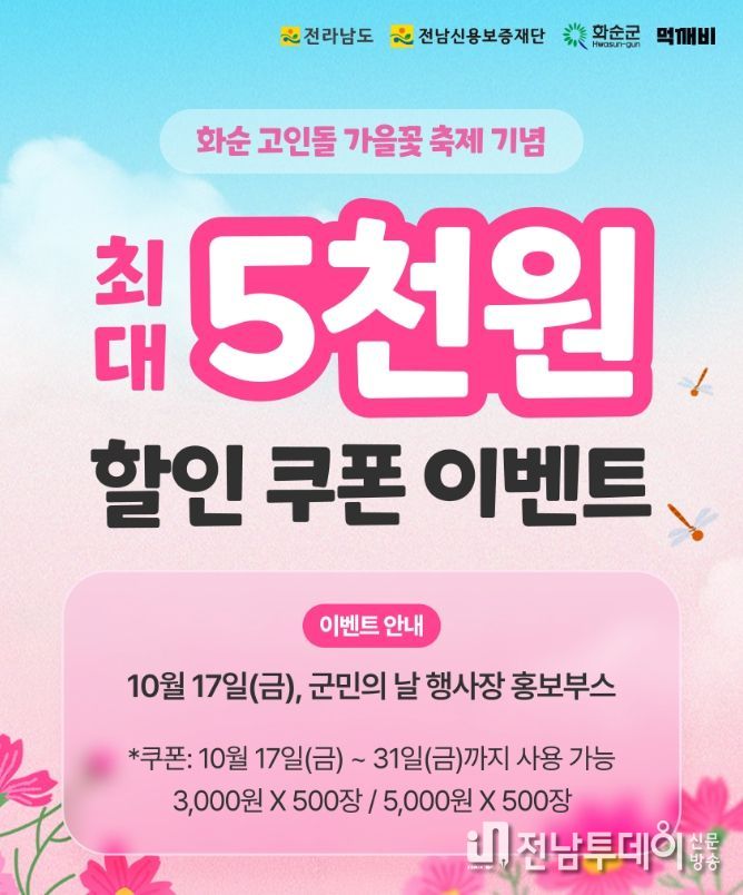 전남투데이 강영선 기자 | 화순군은 오는 10월 17일 제44회 화순군민의 날 행사장에서 2025 화순 고인돌 가을꽃 축제 기념 공공배달앱 ‘먹깨비’ 이벤트를 진행한다고 밝혔다.