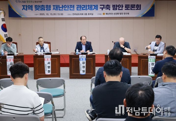 전남투데이 손영욱 기자 | 전라남도의회 의원 연구단체인'재난안전 선진화 방안 연구회'는 지난 10월 15일 전라남도의회 초의실에서 강정일 대표의원(광양2) 주재로 ‘지역 맞춤형 재난안전 관리체계 구축 방안’에 대한 토론회를 개최했다.