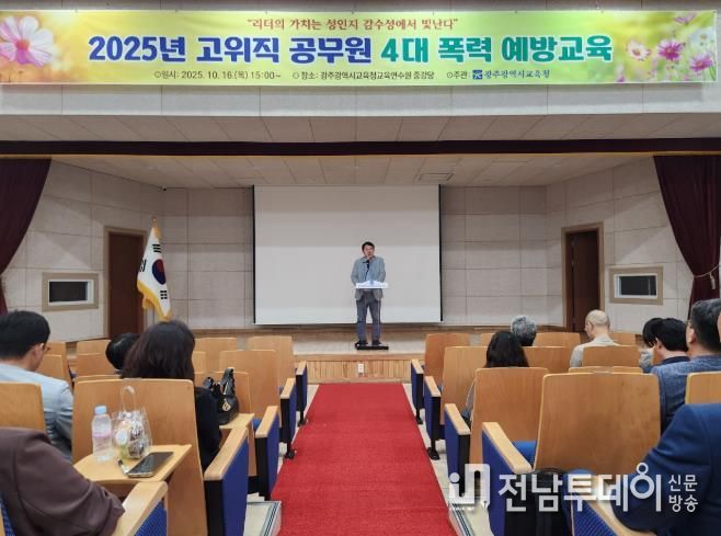 전남투데이 정홍균 기자 | 광주시교육청은 16일 교육연수원 중강당에서 5급 이상 공무원을 대상으로 ‘4대 폭력(성희롱·성매매·성폭력·가정폭력) 예방교육’을 실시했다.