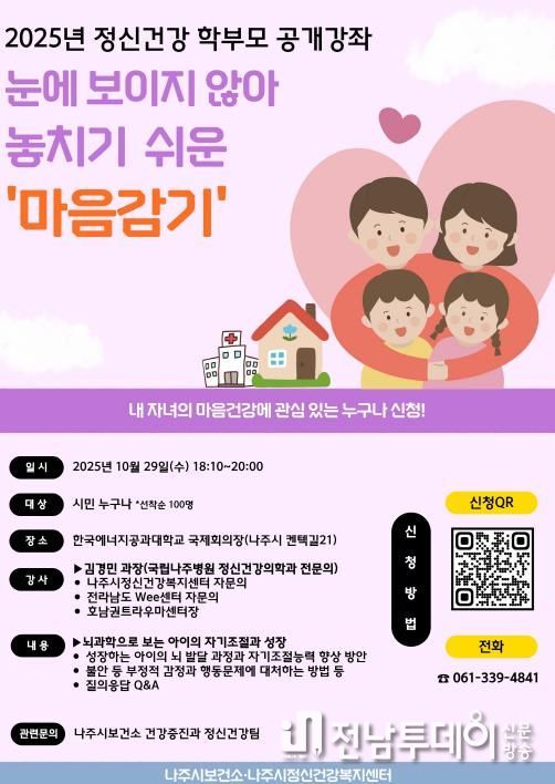 강용곤 나주시 보건소장은 “이번 강좌를 통해 학부모들이 자녀의 정신건강에 대해 더 잘 이해하고 건강한 양육 방법을 알아가는 시간이 되길 바란다”며 “앞으로도 부모와 자녀의 정신건강 증진을 위한 사업을 적극 추진하겠다”고 밝혔다.