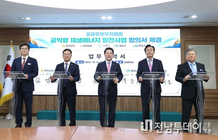 전남투데이 박상훈 기자 | 영암군이 15일 전남도청에서 전라남도, 나주시, 영광군, 한전KDN(주)과 ‘공공 유휴부지 활용 공익형 재생에너지 발전사업 업무협약’을 체결했다.