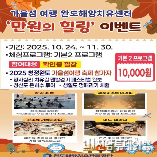 전남투데이 김용희 기자 | 완도해양치유센터에서 10월 24일부터 26일까지 개최되는 ‘2025 청정 완도 가을 섬 여행’과 연계하여 ‘만원의 힐링’ 이벤트를 진행한다.