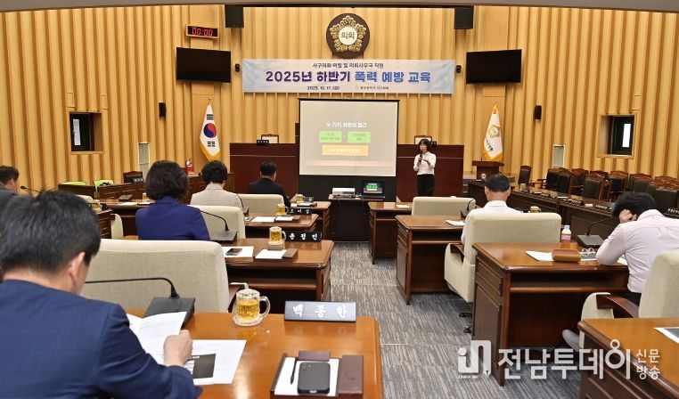 전남투데이 정홍균 기자 | 광주 서구의회는 17일 오후 본회의장에서 의원 및 의회사무국 직원을 대상으로‘2025년 하반기 폭력예방교육’을 실시했다.