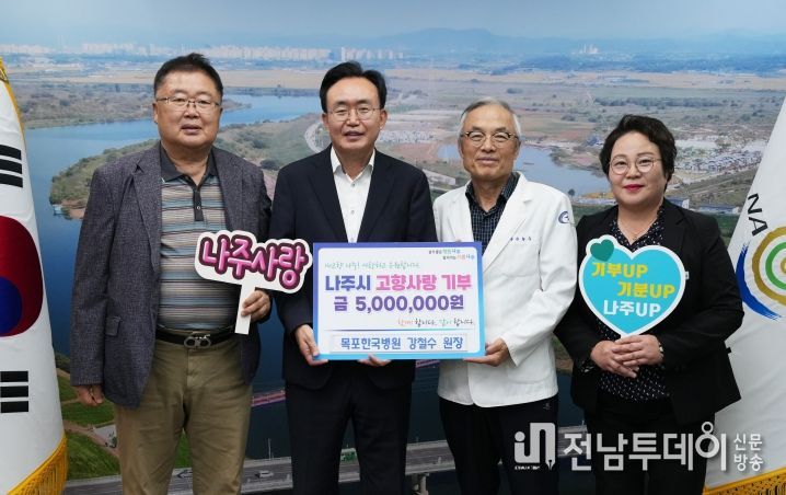 전남투데이 김윤걸 기자 | 전라남도 나주시는 22일 목포한국병원 강철수 원장(오른쪽 두 번째)이 지역사회 발전을 위해 고향사랑기부금 500만 원을 기탁했다고 밝혔다.