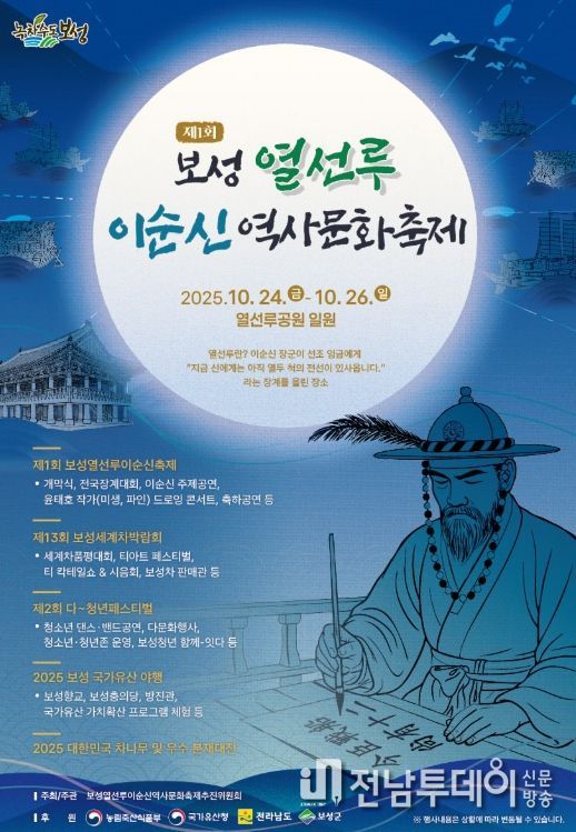 전남투데이 조평훈 기자 | 보성군은 오는 10월 24일부터 26일까지 3일간, 보성읍 열선루공원 일원에서 ‘제1회 보성 열선루 이순신 역사 문화 축제’를 개최한다.