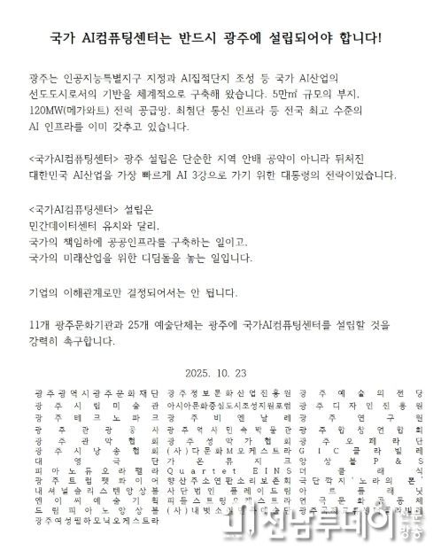 광주문화예술계는 “AI산업의 균형발전과 국가경쟁력 강화를 위해 광주에 국가AI컴퓨팅센터가 설립되어야 한다”며 “문화예술과 기술이 공존하는 창의도시 광주에서 대한민국 AI산업의 새로운 도약이 시작되길 바란다”고 덧붙였다.