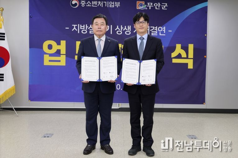 전남투데이 김길룡 기자 | 전남 무안군은 24일 무안전통시장에서 중소벤처기업부(장관 한성숙)와 『지방살리기 상생 자매결연』 업무협약을 체결했다.