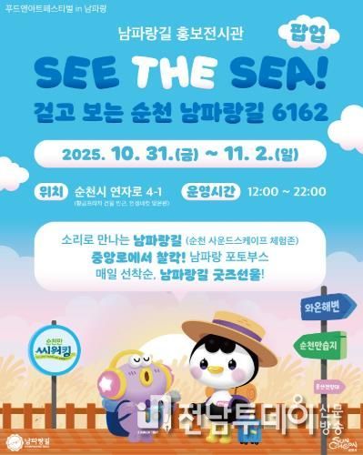 전남투데이 조평훈 기자 | 순천시는 푸드앤아트페스티벌이 열리는 중앙로 일대에 남파랑길 홍보 전시관을 운영해 순천의 바다와 길을 ‘소리’로 만나는 감각적인 공간을 마련한다고 밝혔다.