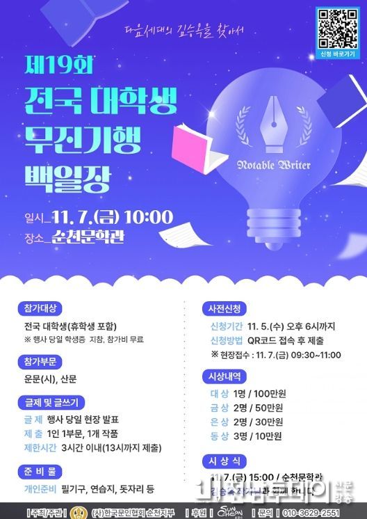전남투데이 조평훈 기자 | 한국문인협회 순천지부는 오는 7일 순천문학관 일원에서 ‘제19회 전국대학생 무진기행 백일장’을 개최한다고 밝혔다.
