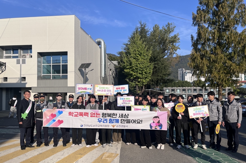 이날 캠페인은 순천경찰서, 순천교육지원청, 왕조지구대, 교사-학생회 등 40여명이 참석해“청소년 마약 및 사이버도박 OUT!, 내 사전에 학교폭력은 없다”예방 문구가 적힌 피켓을 들고 등교하는 학생들을 맞이하며 적극적인 관심과 실천을 당부하는 홍보활동을 전개했다.