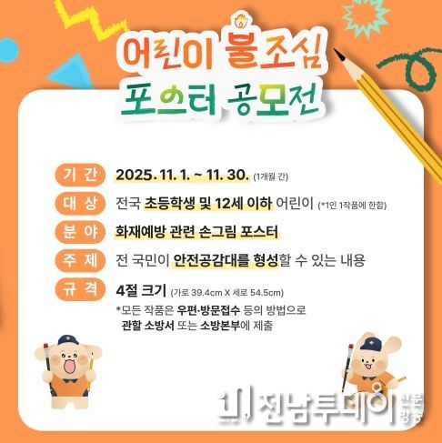 전남투데이 김완규 기자 | 해남소방서가 11월 불조심 강조의달을 맞아 이달 21일까지 지역 내 초등학생 및 12세 이하 어린이를 대상으로 불조심 포스터 공모전을 개최한다.