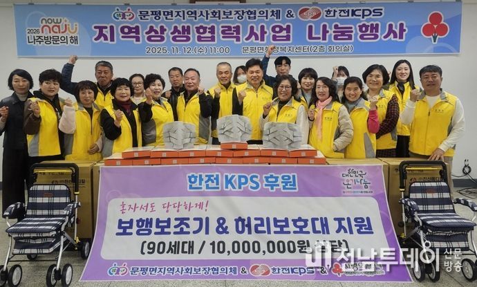 전남투데이 김윤걸 기자 | 전라남도 나주시 문평면지역사회보장협의체(이하 문평면지사협)와 한전 KPS가 거동 불편 어르신 등 저소득 취약계층 90가구에 1천만 원 상당의 보행 보조기와 허리 보호대를 전달해 주민들로부터 호평받고 있다.