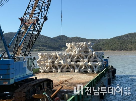 전남투데이 김길룡 기자 | 신안군은 다이아몬드 해역 내 수산자원 산란·서식장 조성 일환으로 지난 9월 인공어초 68개 설치에 이어, 11. 12일 수요일 올해 마지막 인공어초 123개를 추가로 투하했다.