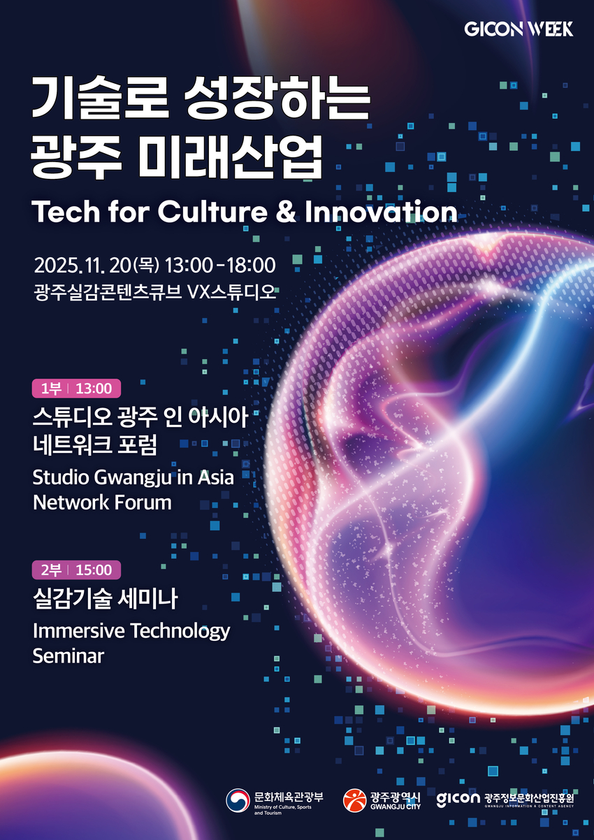 한편 글로벌실감기술행사는 ‘2025 GICON WEEK’ 행사의 일환으로 오는 11월 20일, 21일 양일간 광주실감콘텐츠큐브에서 개최되어 광주 시민들이 ‘인공지능 중심도시’ 대한 인식을 넓히고, 지역의 일상에 체감될 수 있도록 미래 콘텐츠 기술 체험, 다양한 이벤트 등이 진행되며, 시민 누구나 무료로 참여할 수 있다.