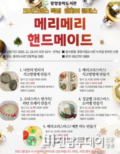 전남투데이 조평훈 기자 | 광양중마도서관이 12월 5일부터 13일까지 총 5회에 걸쳐 진행되는 크리스마스 특집 원데이 클레스 '메리메리 핸드메이드' 프로그램에 참여할 수강생을 모집한다.