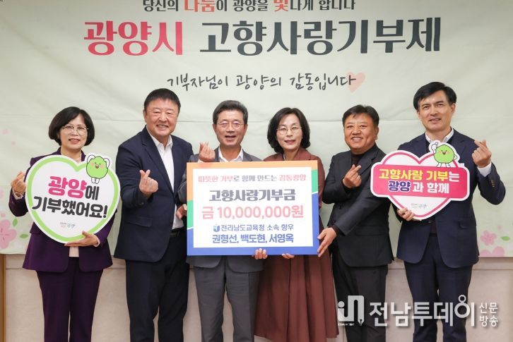 전남투데이 조평훈 기자 | 광양시는 전남교육청 소속 광양출신 향우 3명이 고향사랑의 뜻을 모아 총 1,000만 원의 고향사랑기부금을 전달했다고 밝혔다.