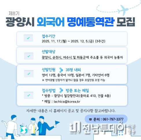 전남투데이 조평훈 기자 | 광양시가 국제교류 현장에서 활동할 ‘제8기 외국어 명예통역관’을 모집한다.