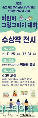 전남투데이 조평훈 기자 | 순천시는 오는 11월 25일부터 12월 31일까지 순천시립뿌리깊은나무박물관 상설전시실 로비에서 '제3회 순천시립뿌리깊은나무박물관 한글날 한창기 기념 어린이 그림그리기 대회 수상작 전시회'를 개최한다.