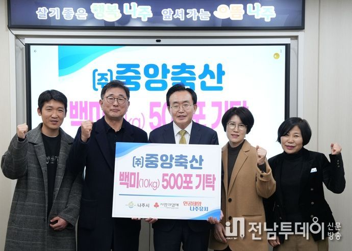 전남투데이 김윤걸 기자 | 전라남도 나주시가 지역기업 ㈜중앙축산으로부터 사회복지시설과 취약계층을 위한 백미 500포 기탁을 받아 겨울철 생활안정을 위한 나눔 확산에 나섰다.
