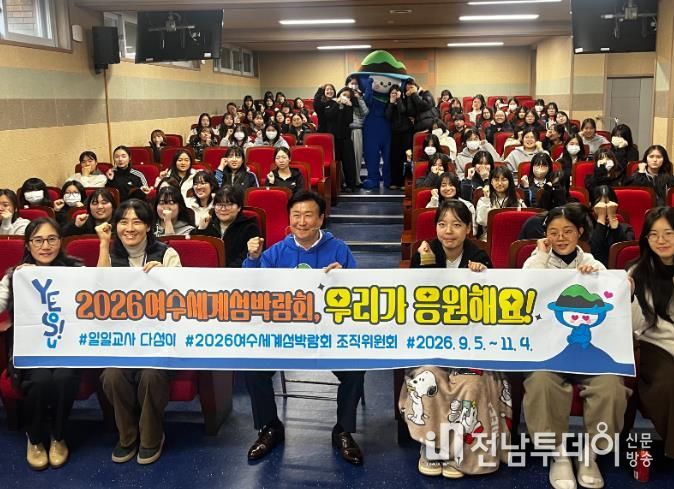전남투데이 조평훈 기자 | (재)2026여수세계섬박람회 조직위원장 정기명 여수시장이 섬박람회를 알리기 위해 여수 중앙여자고등학교에 일일교사 다섬이로 나섰다.