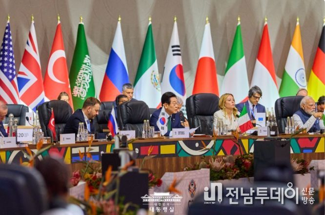 전남투데이 정홍균 기자 | 이재명 대통령은 23일(현지시간) 오전 요하네스버그 G20 정상회의 마지막 세션에 참석해 '모두를 위한 공정한 미래'를 주제로 ▴인공지능(AI) 기술 협력 ▴핵심광물 공급망 협력 ▴양질의 일자리 창출을 통한 포용적 성장 방안 등에 대해 논의했다.
