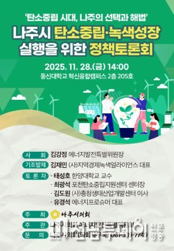 전남투데이 김윤걸 기자 | 나주시의회는 오는 11월 28일 오후 2시, 동신대학교 혁신융합캠퍼스 205호에서 '나주시 탄소중립·녹색성장 실행을 위한 정책토론회'를 개최한다.