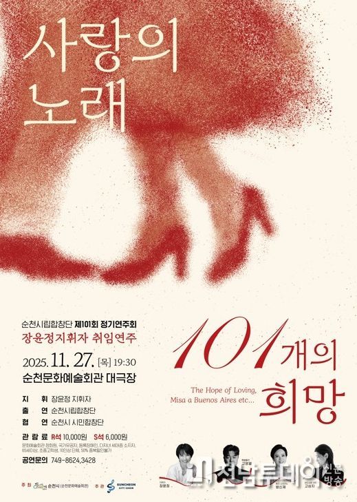 전남투데이 조평훈 기자 | 순천시는 오는 27일 저녁 7시 30분, 순천문화예술회관 대극장에서 순천시립합창단 제101회 정기연주회 '사랑의 노래, 101개의 희망'을 개최한다고 밝혔다.