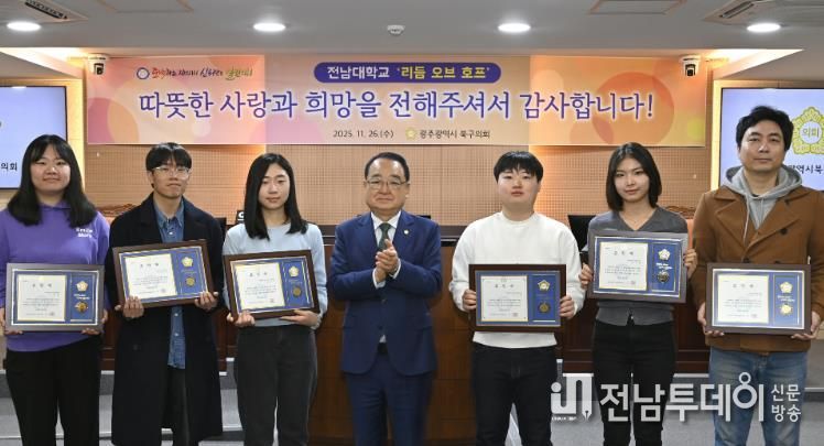 전남투데이 김경민 기자 | 광주 북구의회가 26일 본회의장에서 전남대학교 봉사동아리 ‘리듬오브호프’ 회원 6명에게 의장 표창을 수여했다.