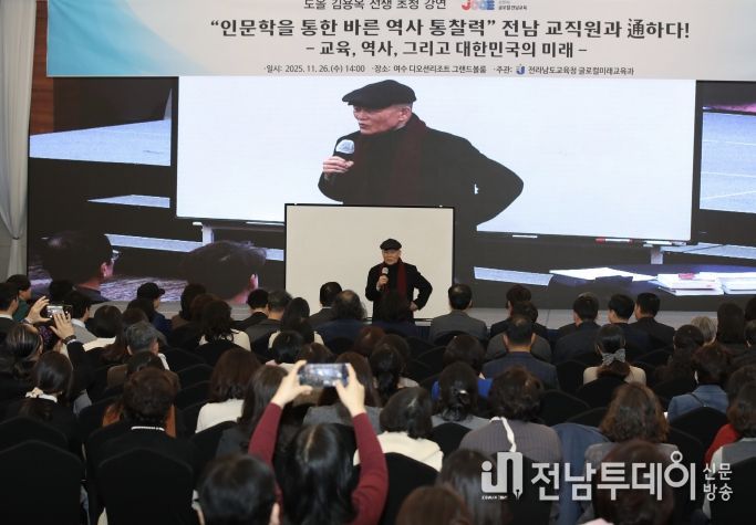 전라남도교육청이 26일 여수 디오션리조트에서 개최한 인문학 강연회에서 도올 김용옥 선생은 AI 시대의 교육이 나아가야 할 방향을 이같이 제시했다. ‘교육,역사, 그리고 대한민국의 미래’를 주제로 한 이번 강연에는 전남 초·중·고 교직원과 학부모 500여 명이 참석해 관심을 모았다.