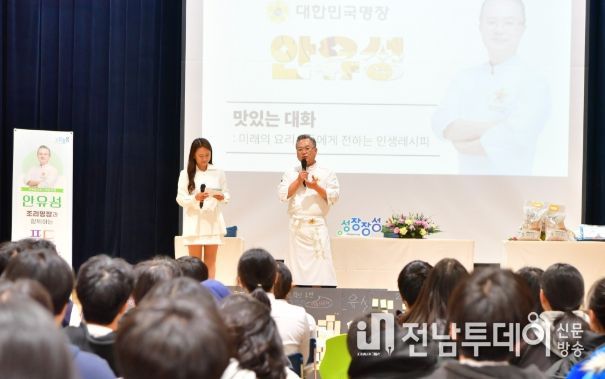 전남투데이 이현승 기자 | 장성군이 26일 장성하이텍고등학교 대강당에서 일식의 대가 안유성 명장을 초청해 ‘푸드 토크쇼’를 진행했다. 학생과 학부모, 교직원 등 200여 명이 참석했다.
