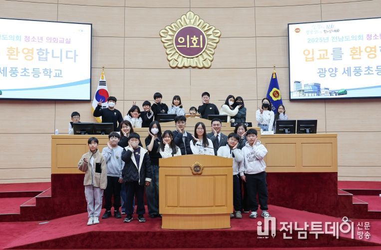 전남투데이 김용희 기자 | 전남도의회 임형석 의원(더불어민주당ㆍ광양1)은 12월 2일, 전남도의회 본회의장에서 주종섭 전남도의원(더불어민주당ㆍ여수6)과 함께 ‘제25회 청소년 의회교실’에 참여한 광양세풍초등학교와 여수예울초등학교 학생들을 격려하고 소통하는 시간을 가졌다.