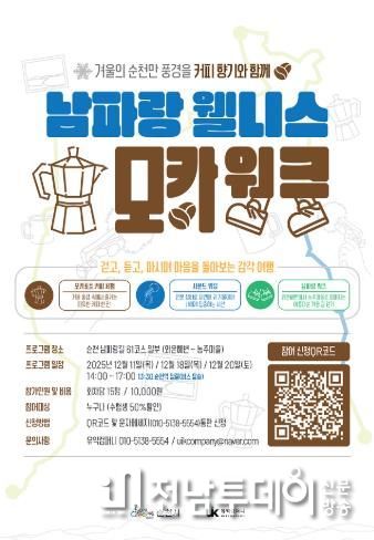전남투데이 조평훈 기자 | 순천시는 겨울철 남파랑길 61코스에서 걷기와 감성 체험을 결합한 '남파랑 웰니스 모카 워크' 프로그램을 오는 11일부터 20일까지 3회 운영한다고 밝혔다.