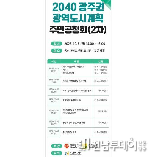 전남투데이 김경민 기자 | 광주광역시와 전라남도는 5일 전남 나주시 동신대학교 중앙도서관 동강홀에서 ‘2040 광주권 광역도시계획(안) 공청회’를 개최한다.