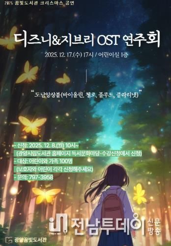 전남투데이 조평훈 기자 | 광양꿈빛도서관이 오는 12월 17일 오후 5시 어린이실에서 어린이와 가족 100명을 대상으로 ‘디즈니&지브리 OST 연주회’를 개최한다.