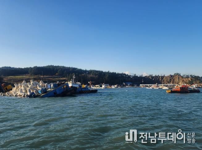 전남투데이 김용희 기자 | 완도해양경찰서는 오늘 오전 8시 11분경 전남 완도군 청산도 도청항내에서 바지선 A호(414톤, 승선원 2명, 테트라포트 800톤 적재)가 좌현으로 약 40도 기울어 침수되는 사고가 발생했다고 밝혔다.
