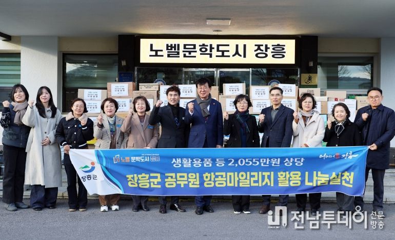 전남투데이 김용희 기자 | 장흥군 공무원 122명이 공적 항공마일리지를 활용해 마련한 20,558,250원 상당의 생필품 197점을 지역 취약계층에 전달했다.
