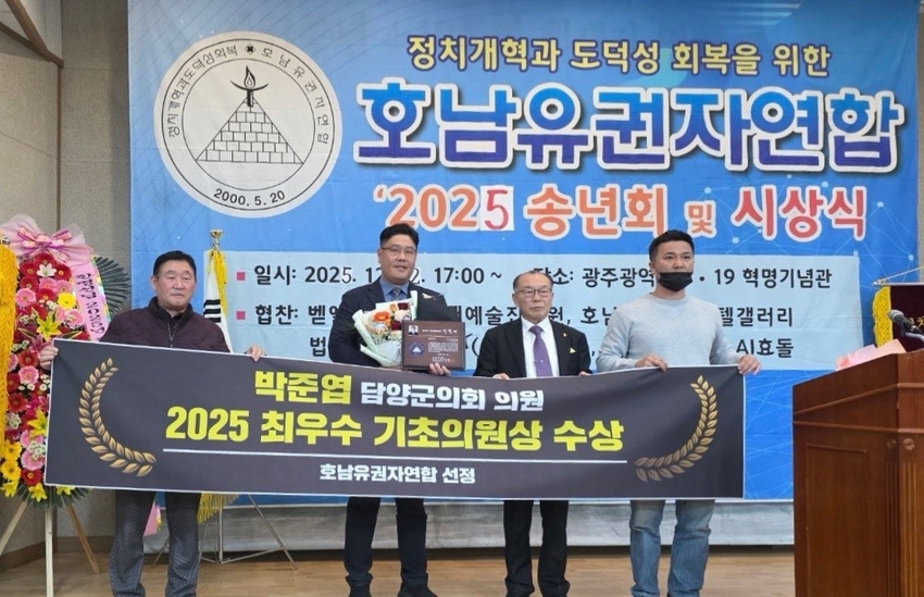 전남투데이 김길룡 기자 | 담양군의회 박준엽 의원이 지난 12일 4.19혁명 기념관에서 열린 '제16회 2025 호남유권자연합 시상식'에서 '2025 최우수 기초의원'으로 선정돼 수상의 영예를 안았다.