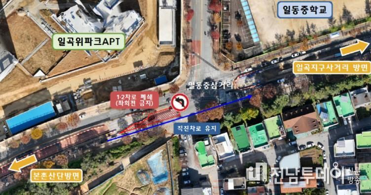 좌회전이 필요한 차량은 약 430m 앞 일곡지구입구 사거리를 이용해 우회하면 된다.