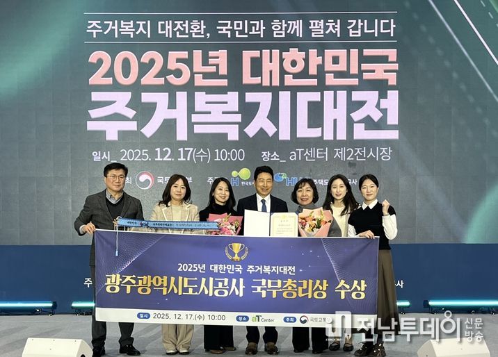 전남투데이 김경민 기자 | 광주도시공사(사장 김승남)는 17일 서울 양재 aT센터에서 열린 ‘2025 대한민국 주거복지대전’에서 주거복지 향상 및 서민 주거안정에 기여한 공로를 인정받아 국무총리 표창을 수상했다고 밝혔다.