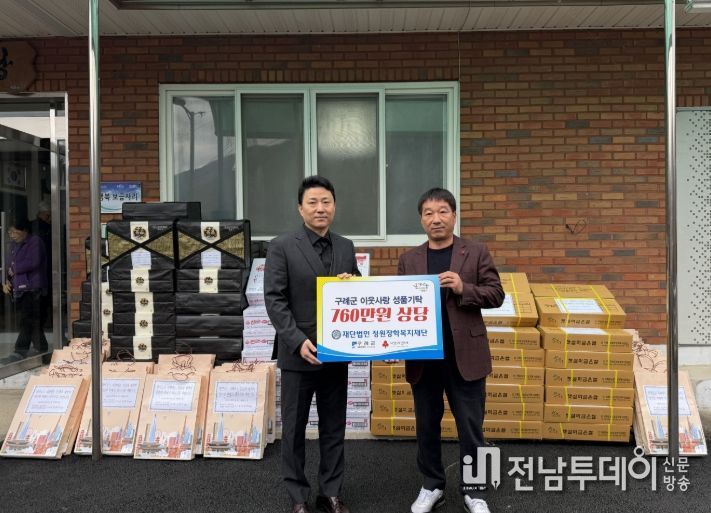 전남투데이 강길수 기자 | 전남 구례군은 12월 19일, (재)정원장학복지재단(이사장 김용만)에서 토지면 신촌마을 주민과 관내 가정위탁세대를 위해 쌀(20kg), 돼지고기 세트, 생필품 세트, 라면 등 총 760만 원 상당의 물품을 전달했다고 밝혔다.